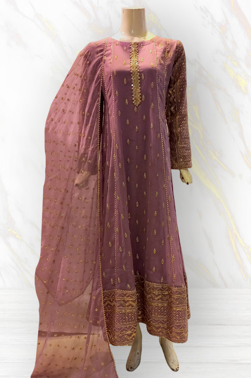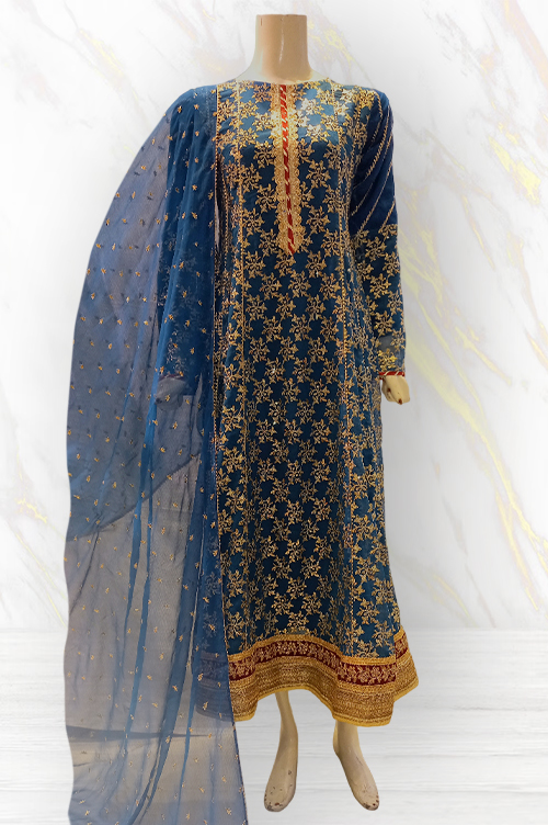 A full length chiffon suit in blue, embroidered with elegant design. Complete with fully lined sleeves.