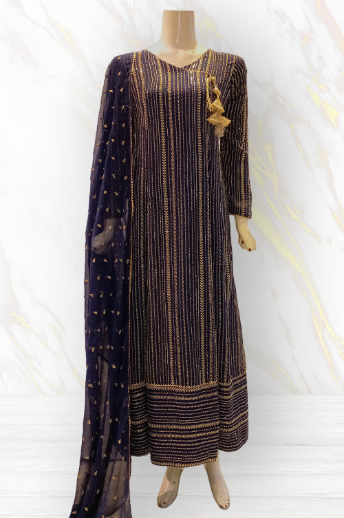 A full length chiffon suit in blue, embroidered with elegant design. Complete with fully lined sleeves.