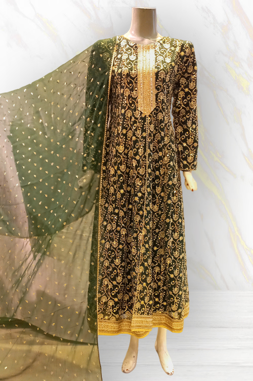 A full length chiffon suit in forest green, embroidered with elegant design. Complete with fully lined sleeves.
