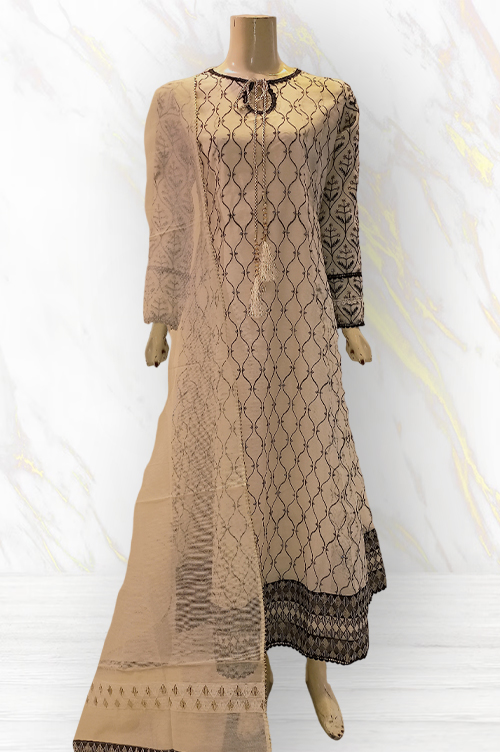 Embroidered Khaadi Net 3PC White and Black Dress HNC-23-209