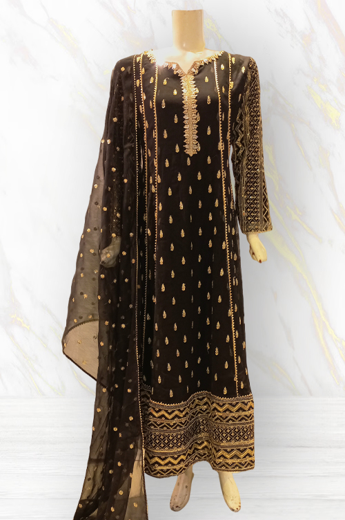 Heavily Embroidered Chiffon 3PC Black Dress HNC-23-203
