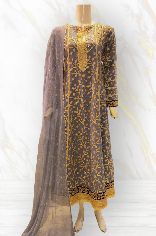 Heavily Embroidered Chiffon 3PC Gray Dress HNC-23-213