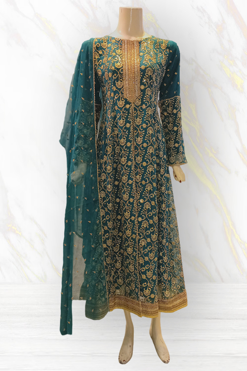 Heavily Embroidered Chiffon 3PC Teal Dress HNC-23-208